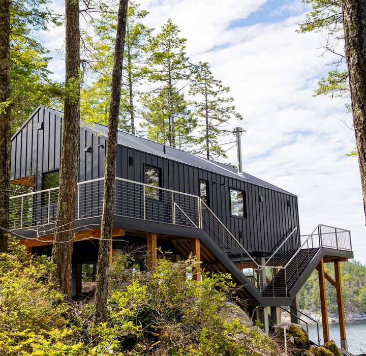 Before design and construction began, Hayden and the client scoped out potential locations on the property, evaluating sightlines, access, tides, terrain, and the overall experience of arriving at the structure. The final concept balanced simplicity with character: a compact, striking A-frame form that complements the natural setting while providing a memorable and functional guest space.